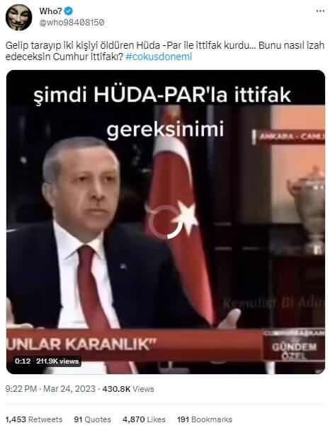 Who? (@who98408150): “Gelip tarayıp iki kişiyi öldüren Hüda -Par ile ittifak kurdu… Bunu nasıl izah edeceksin Cumhur ittifakı? #cokusdonemi”