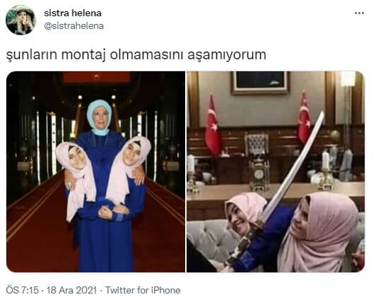Paylaşılan görsel, Cumhurbaşkanı Erdoğan’ın ve eşi Emine Erdoğan’ın Kahramanmaraş’ta yaşayan siyam ikizleri Sema ve Ayşe Tanrıkulu ile 22 Ağustos 2019 günü Cumhurbaşkanlığı Külliyesi’nde bir araya geldiği ziyaret esnasında kaydedilen bir fotoğraf üzerinde oynanarak oluşturulmuş.
