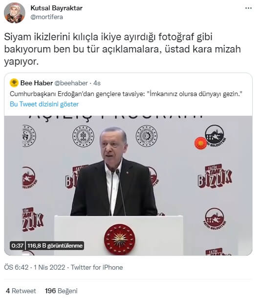 “Siyam ikizlerini kılıçla ikiye ayırdığı fotoğraf gibi bakıyorum ben bu tür açıklamalara, üstad kara mizah yapıyor.”