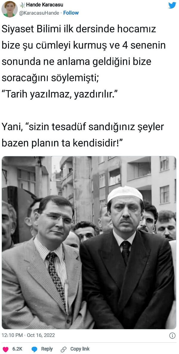 “Siyaset Bilimi ilk dersinde hocamız bize şu cümleyi kurmuş ve 4 senenin sonunda ne anlama geldiğini bize soracağını söylemişti; “Tarih yazılmaz, yazdırılır.” Yani, “sizin tesadüf sandığınız şeyler bazen planın ta kendisidir!””