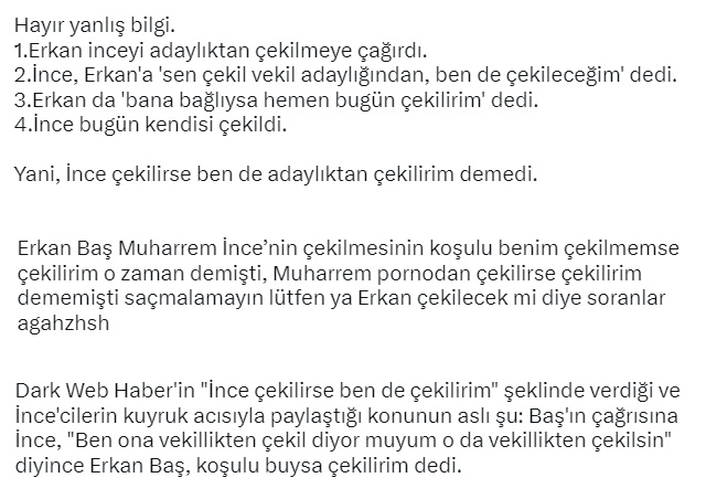 “Dark Web Haber’in “İnce çekilirse ben de çekilirim” şeklinde verdiği ve İnce’cilerin kuyruk acısıyla paylaştığı konunun aslı şu: Baş’ın çağrısına İnce, “Ben ona vekillikten çekil diyor muyum o da vekillikten çekilsin” diyince Erkan Baş, koşulu buysa çekilirim dedi.”