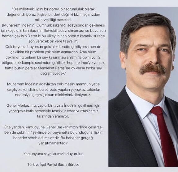 Muharrem İnce’nin Cumhurbaşkanlığı adaylığından çekilmesiyle birlikte Türkiye İşçi Partisi (TİP) Genel Başkanı Erkan Baş‘ın “Muharrem İnce’nin Cumhurbaşkanı adaylığından çekilmesi durumunda milletvekilli adaylığından çekileceğini” söylediği iddiası gündeme geldi.