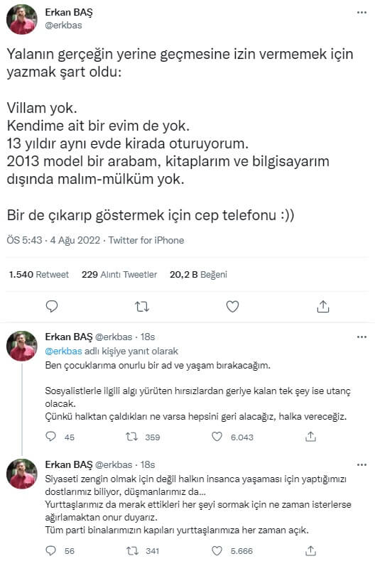 TİP Lideri Erkan Baş, konuya dair Twitter üzerinden “13 yıldır aynı evde kirada oturuyorum, malım mülküm yok” açıklamasında bulundu.