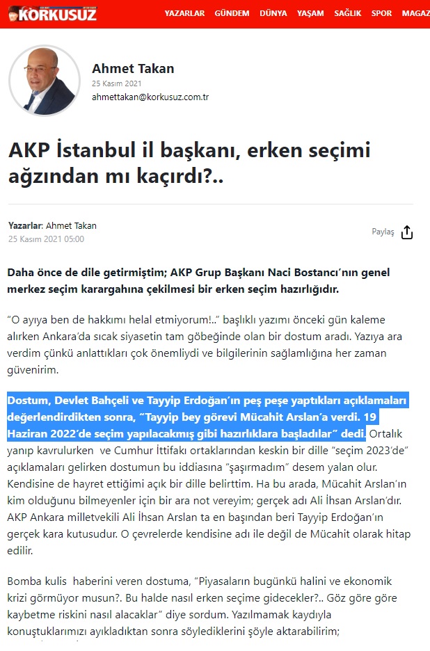 Korkusuz gazetesi yazarı Ahmet Takan, 25 Kasım 2021 tarihli “AKP İstanbul il başkanı, erken seçimi ağzından mı kaçırdı?” başlıklı köşe yazısında “Ankara’dan güvendiği bir kaynağın” kendisine seçimlerin 19 Haziran 2022’de yapılacağını söylediğini belirtmişti.