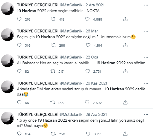 Ankara Kuşu adlı Twitter profili de “2022 yılının Mart veya Nisan ayında erken seçim var. Yeni net bilgidir yayabilirsiniz.” ve “Erken seçim için tarih tahminim; 27 Mart 2022” gibi paylaşımlarla yanılmıştı.