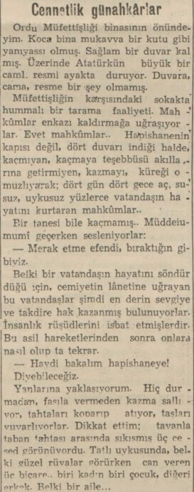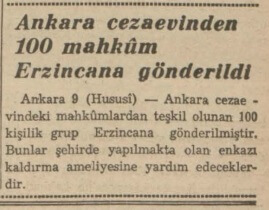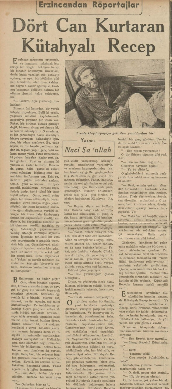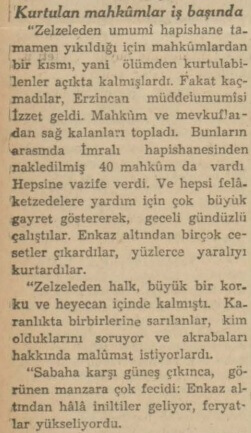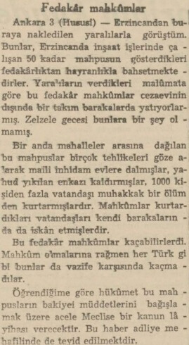 “Erzincandan buraya nakledilen yaralılarla görüştüm. Bunlar, Erzincanda inşaat işlerinde çalışan 50 kadar mahpusun gösterdikleri fedakârlıktan hayranlıkla bahsetmektedirler. Yaralıların verdikleri malumata göre bu fedakâr mahkûmlar cezaevinin dışında bir takım barakalarda yatıyorlarmış. Zelzele gecesi bunlara bir şey olmamış.