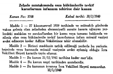 13 Ocak 1940 tarihli 4409 sayılı Resmi Gazete’de yayımlanarak yürürlüğe giren 3768 sayılı 10 Ocak 1940 tarihli “Zelzele mıntakasında ceza hükümlerile tevkif kararlarının infazının tehirine dair kanun” ile tutuklu ve hükümülerin cezalarının ertelenmesi yetkisi Adalet Bakanlığına verilmişti.