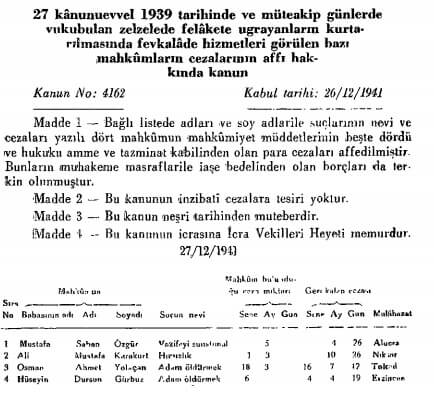 5 Ocak 1942 tarihli 4998 sayılı Resmi Gazete’de yayımlanan 4162 sayılı 26.12.1941 tarihli “27 kânunuevve l 1939 tarihinde ve müteakip günlerde vukubulatı zelzelede felâkete uğrayanların kurtarılmasında fevkalâde hizmetleri görülen bazı mahkûmların cezalarının affı hakkında kanun” ile 4 mahkumun da cezalarına aynı şekilde af getirilmişti.