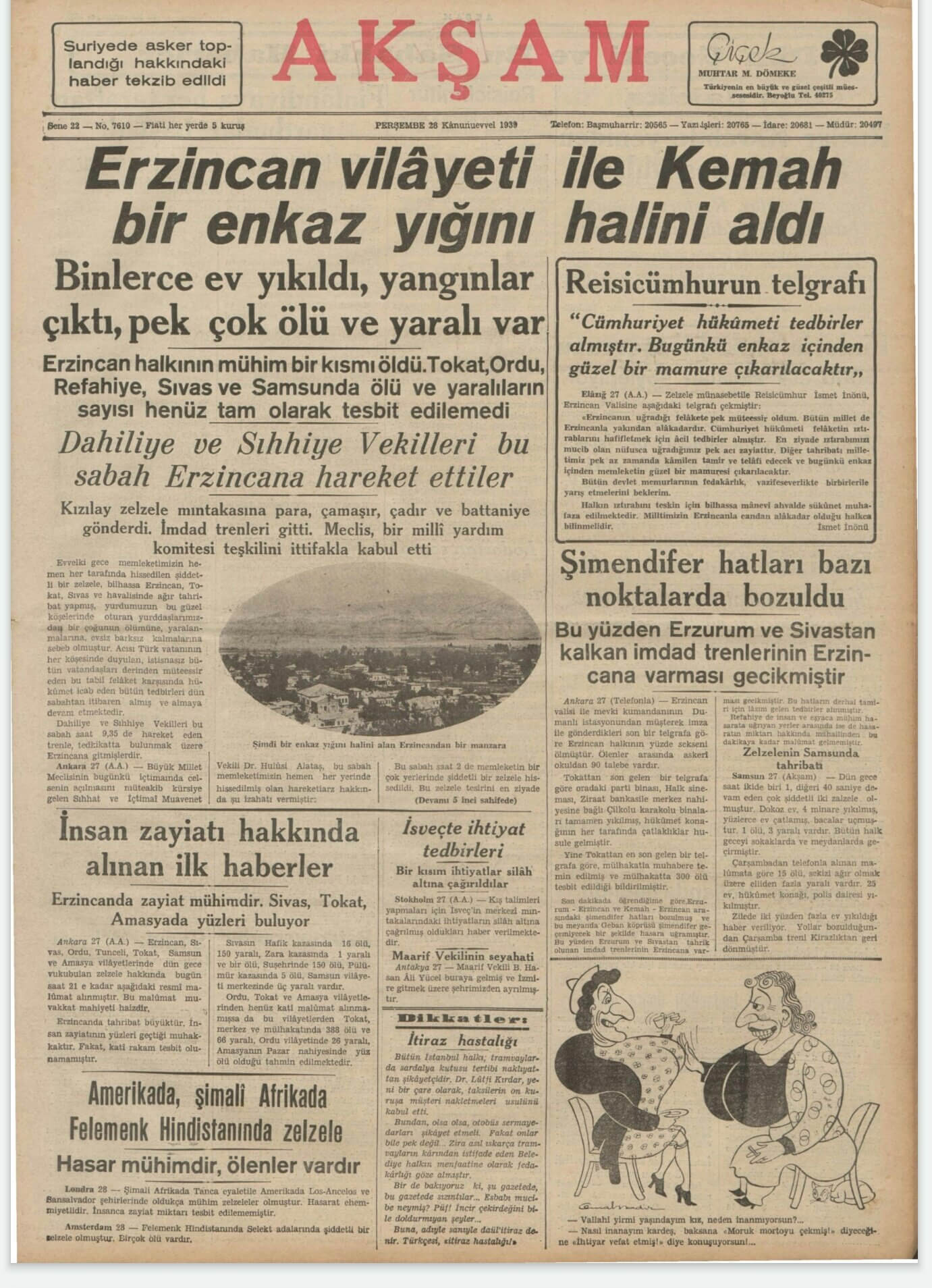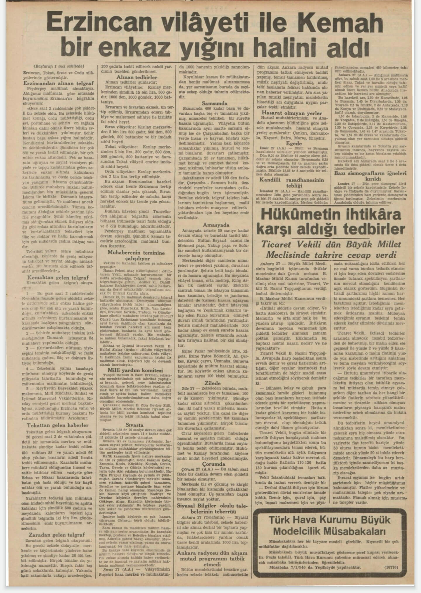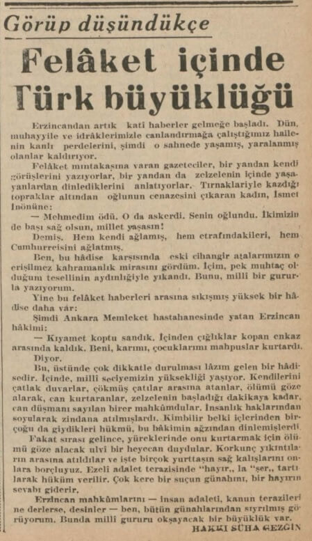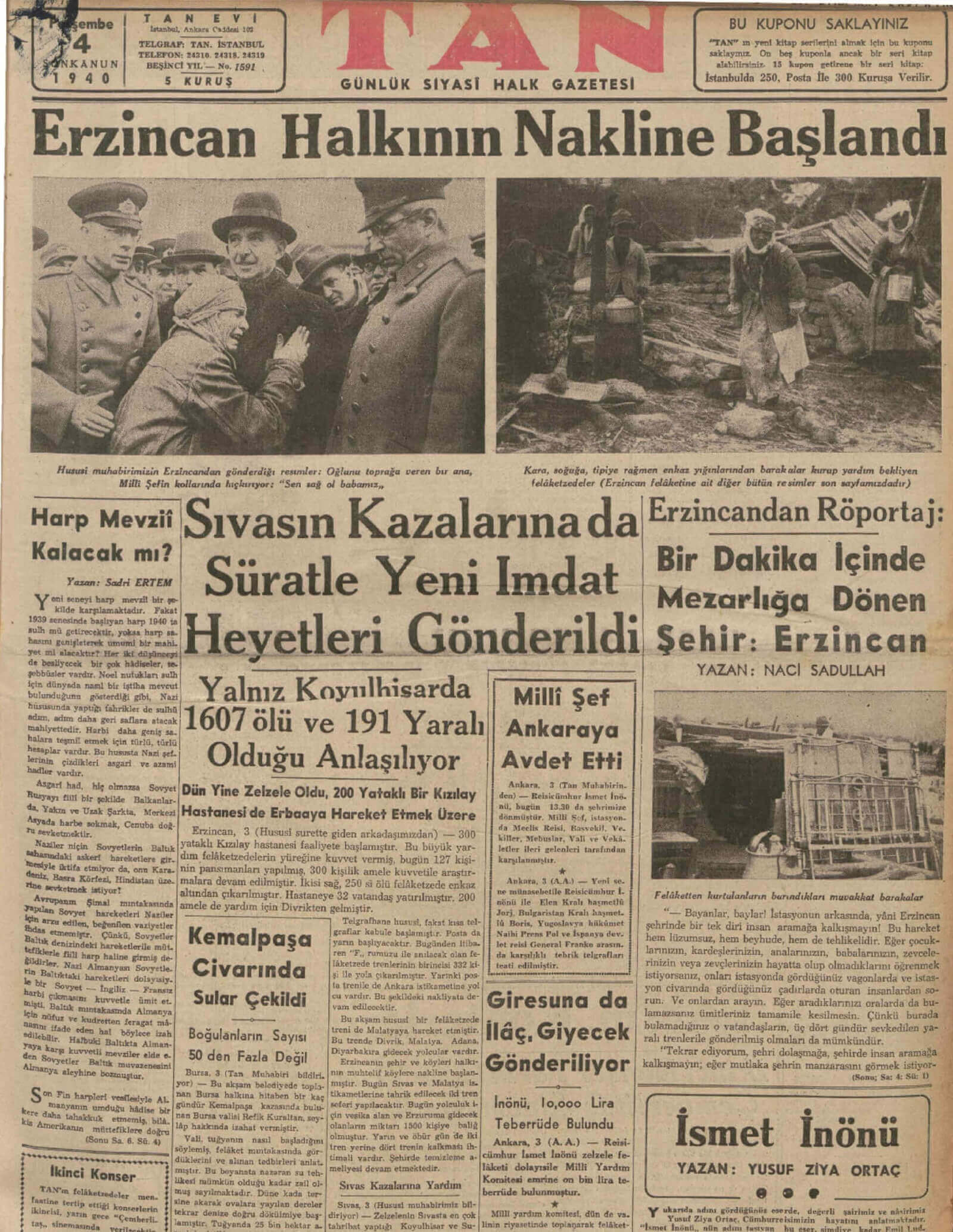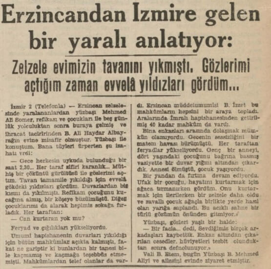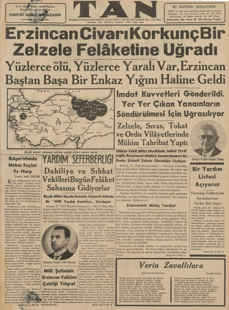 Tan Gazetesinin 28 Aralık 1939 tarihli sayısına “Erzincan Civarı Korkunç Bir Zelzele Felâketine Uğradı” manşetini atmıştı: