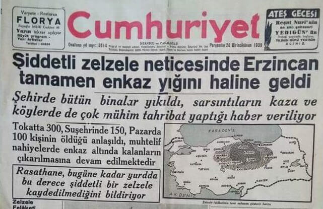 Cumhuriyet Gazetesi ise Erzincan’da meydana gelen depremi 28 Aralık 1938 tarihli sayısında “Şiddetli zelzele neticesinde Erzincan tamamen enkaz yığını haline geldi” manşetiyle okurlarına aktarmıştı.