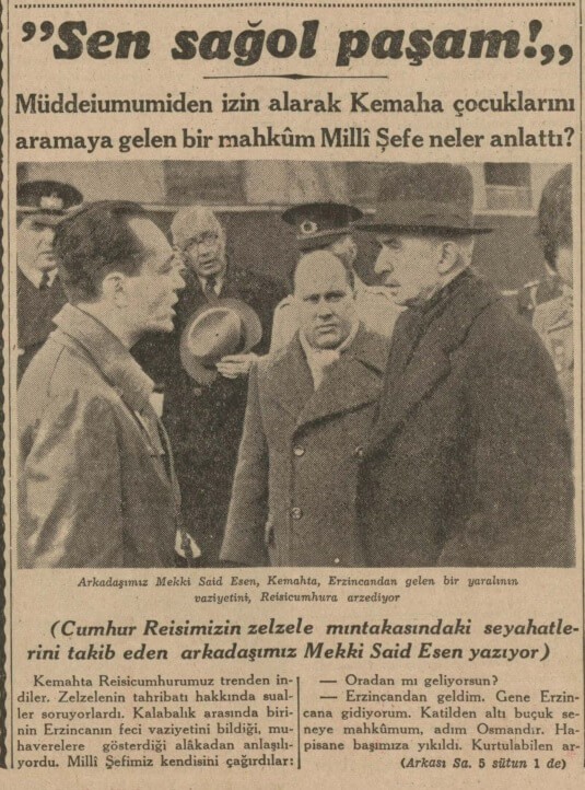 Cumhuriyet’te yayımlanan Mekki Said Esen’in hazırladığı haberde yıkılan Erzincan Cezaevi’nden sağ kurtulan mahkûmların enkaz kurtarma faaliyetlerinde çalıştıkları ve akşam sayıldıkları şu şekilde aktarılmıştı (Cumhuriyet, “Sen Sağol Paşam“, 6 Ocak 1940):