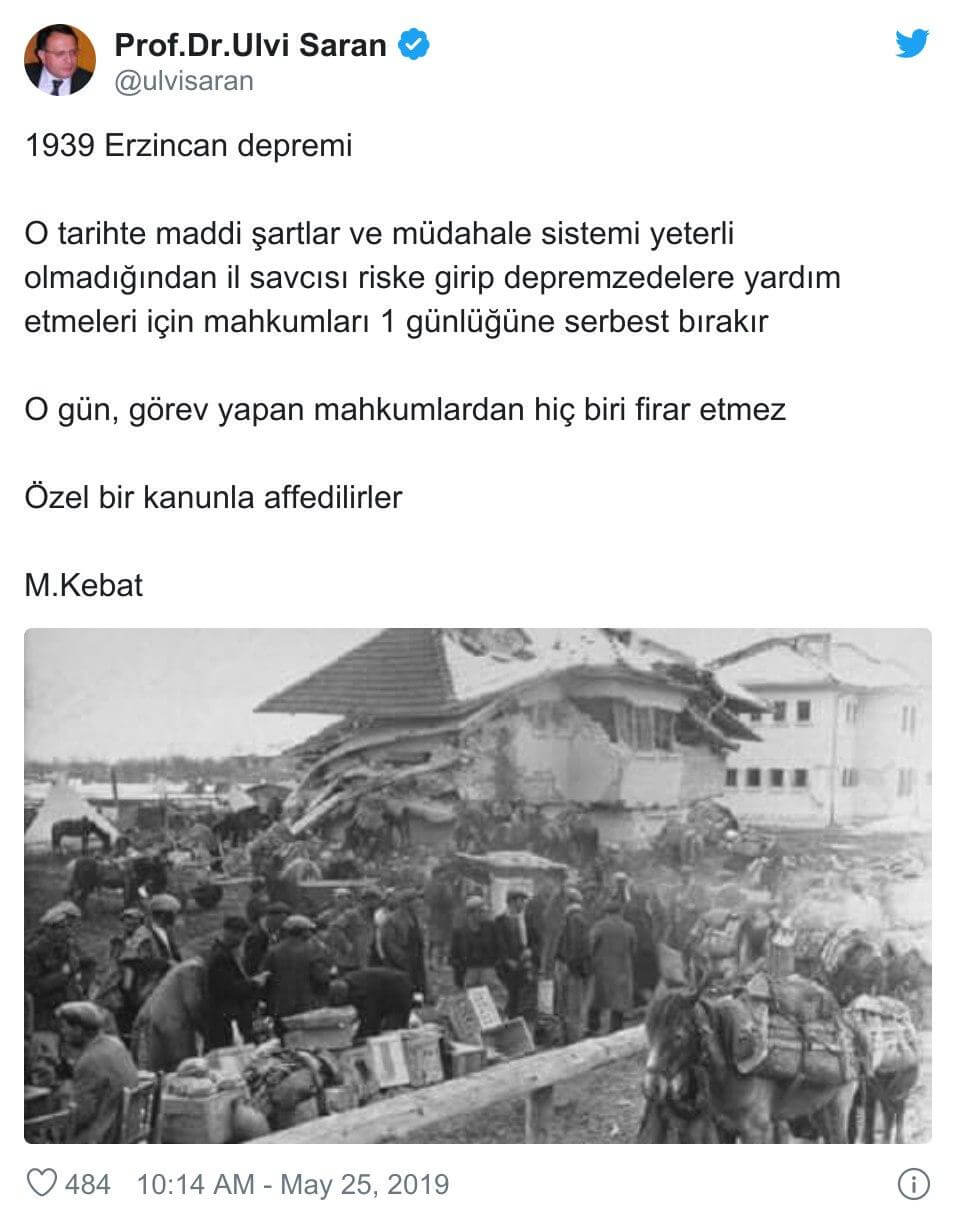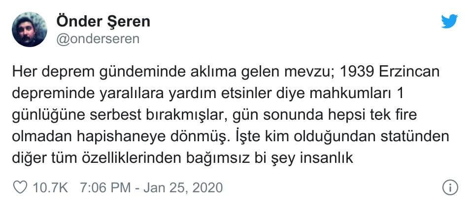“Her deprem gündeminde aklıma gelen mevzu; 1939 Erzincan depreminde yaralılara yardım etsinler diye mahkumları 1 günlüğüne serbest bırakmışlar, gün sonunda hepsi tek fire olmadan hapishaneye dönmüş. İşte kim olduğundan statünden diğer tüm özelliklerinden bağımsız bi şey insanlık”