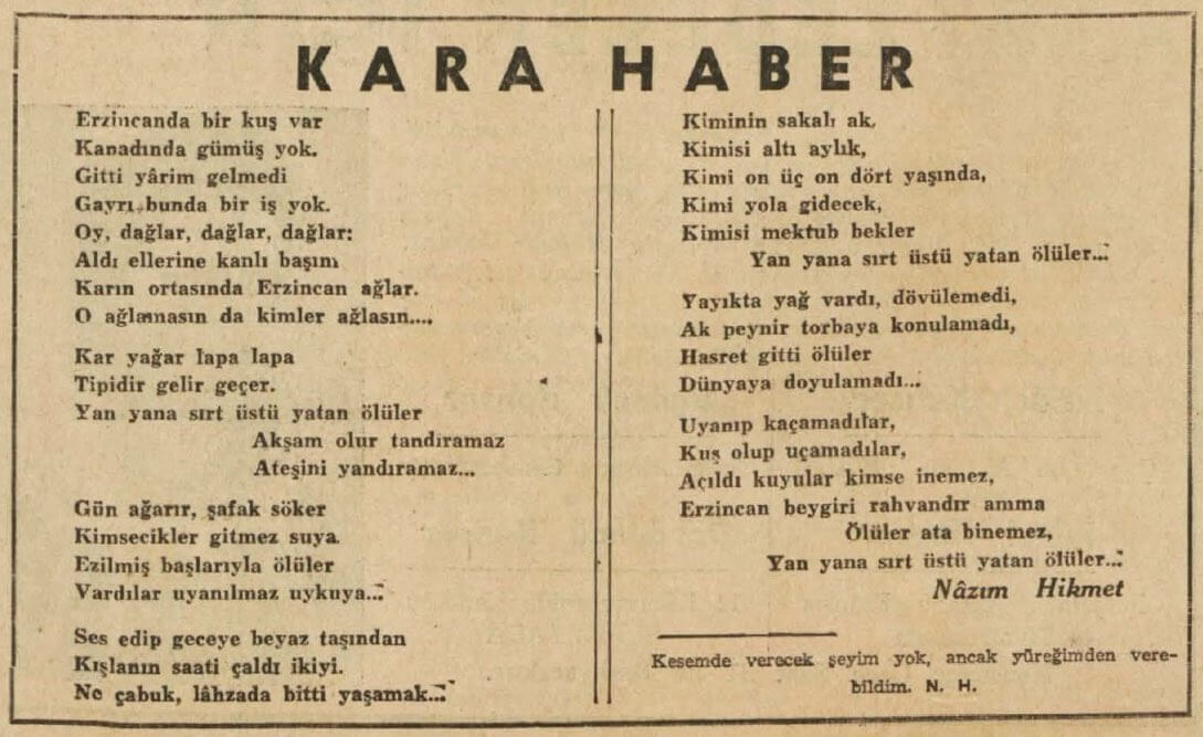 Nâzım Hikmet’in 1929 Erzincan Depremi sonrasında kaleme aldığı Kara Haber başlıklı şiiriyle yazıyı noktalayalım…