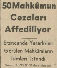 “Adliye Vekâleti, Erzincan felâketinde cansiparane hizmetleri görülen elli kadar mahkûmun isimlerini mahallinden istemiştir. Bunların geriye kalan mahkumiyet müddetlerinin affedilmesi için bir kanun lâyihası hazırlanacaktır.”