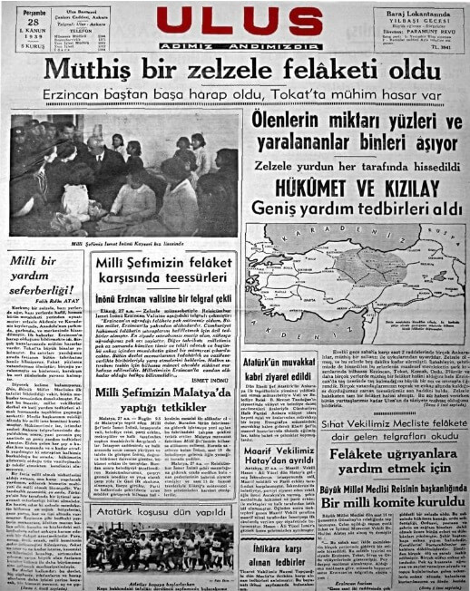 27 Aralık 1939 Erzincan Depremi, Ulus Gazetesince “Müthiş bir zelzele felaketi oldu” manşetiyle haberleşmişti.