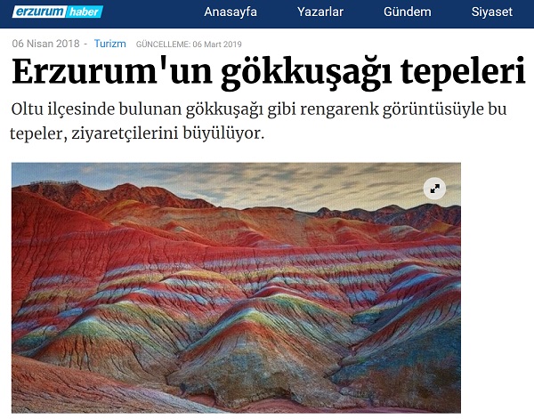 Çin’deki Doğanın büyüleyici güzelliklerinden biri olan bu kırmızı, turuncu, yeşil, sarı renklerdeki yükseltilere ait resimler sıklıkla Erzurum’daki gökkuşağı tepelerine ait şekilde paylaşıldığı görülmektedir.