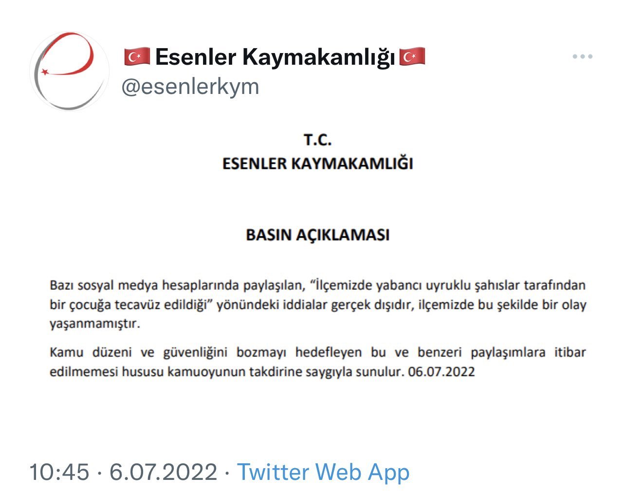 Kamu düzeni ve güvenliğini bozmayı hedefleyen bu ve benzeri paylaşımlara itibar edilmemesi hususu kamuoyunun takdirine saygıyla sunulur. 06.07.2022”