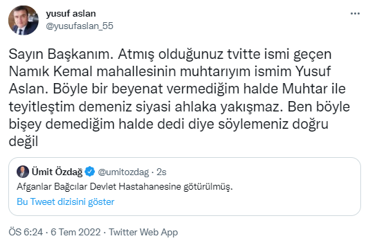 “Sayın Başkanım. Atmış olduğunuz tvitte ismi geçen Namık Kemal mahallesinin muhtarıyım ismim Yusuf Aslan. Böyle bir beyenat vermediğim halde Muhtar ile teyitleştim demeniz siyasi ahlaka yakışmaz. Ben böyle bişey demediğim halde dedi diye söylemeniz doğru değil”