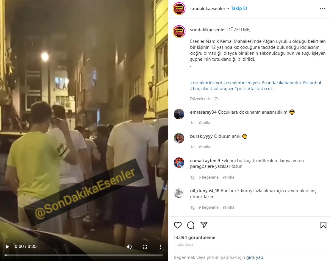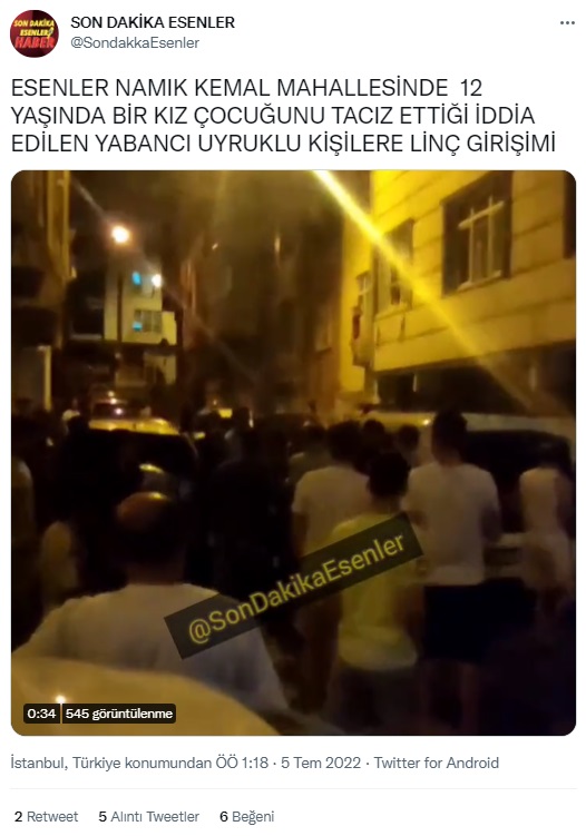 “Dün akşam Esenyurt Namık Kemal mahallesinde 4 Afgan 12 yaşında bir Suriyeli kıza tecavüz etti. Halk sokağa döküldü. Afganlar ağır şekilde dövüldü. Halk mahallemizde yabancı istemiyoruz diyerek emlak komisyoncularına tepki gösterdi. Bıçak sırtında yaşadığımız günlerden geçiyoruz.”