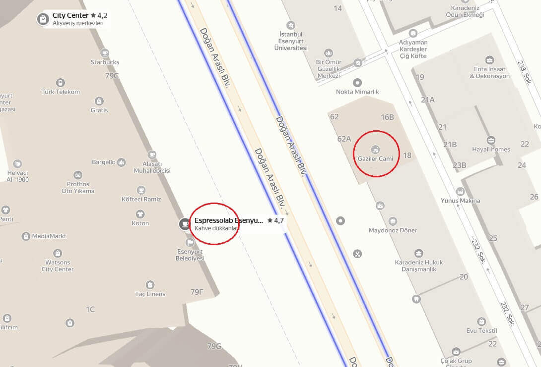 Haritalar üzerinde yapılan incelemede Gaziler Camii ile Espressolab Esenyurt City Center‘ın birbirine yakınlığı görülebiliyor.