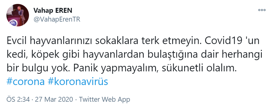 İstanbul Veteriner Hekimler Odası Yönetim Kurulu Başkanı Prof. Dr. Murat Arslan, koronavirüsün insanlara ilk olarak yabani bir hayvandan bulaştığını; ancak evcil hayvanlardan insanlara geçiş olduğuna dair bir kanıt bulunamadığını ifade etmişti.