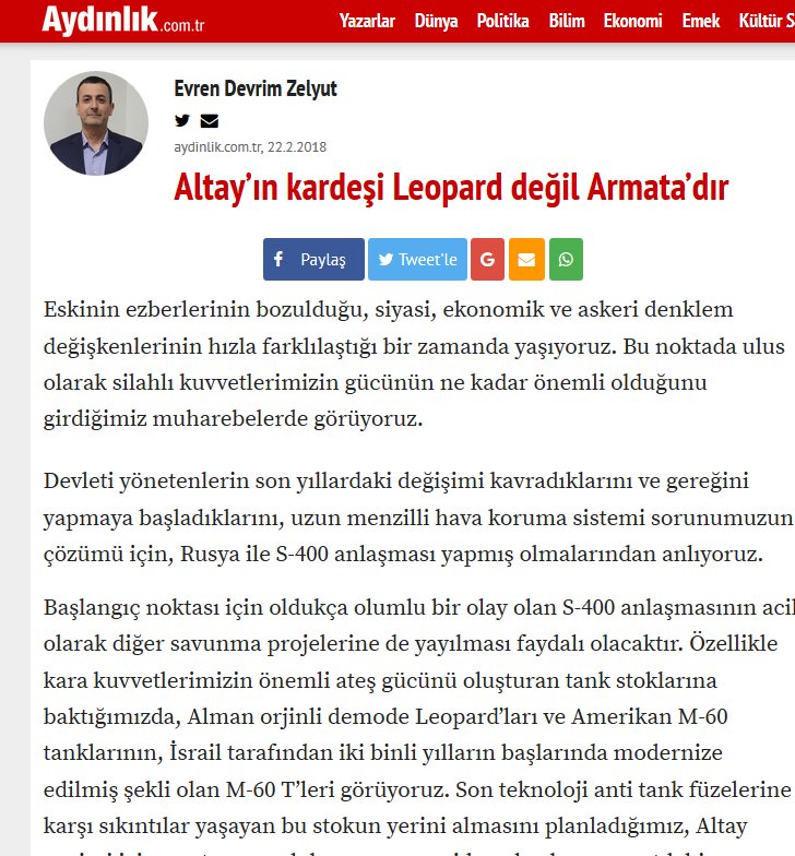 Evren Devrim Zelyut, Aydınlık Gazetesi‘nde 22 Şubat 2018 tarihinde yayınlanan “Altay’ın kardeşi Leopard değil Armata’dır” başlıklı yazısında Altay Tankı Projesi hakkında bir hayli hatalı bilgi paylaşmış.