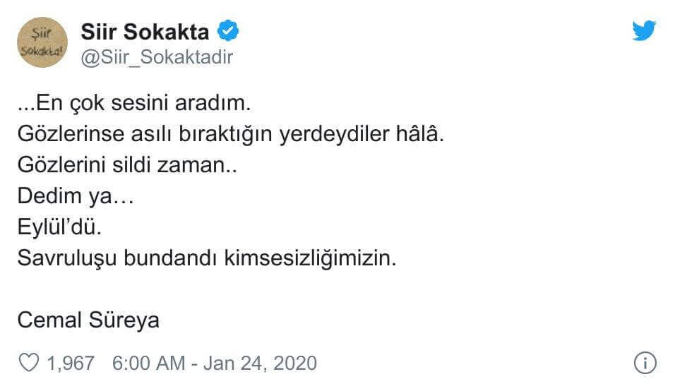 Cemal Süreya’ya ait olduğu iddiasıyla paylaşılan “Hiç sevmedim Eylül’ü. / Ama en içten laflarımı da ona dair ettim / “Dedim ya Eylül’ dü .. Savruluşu bundandı kimsesizliğimizin…” dizeleriyle tanınan “Eylül’dü” başlıklı şiir şu şekilde: