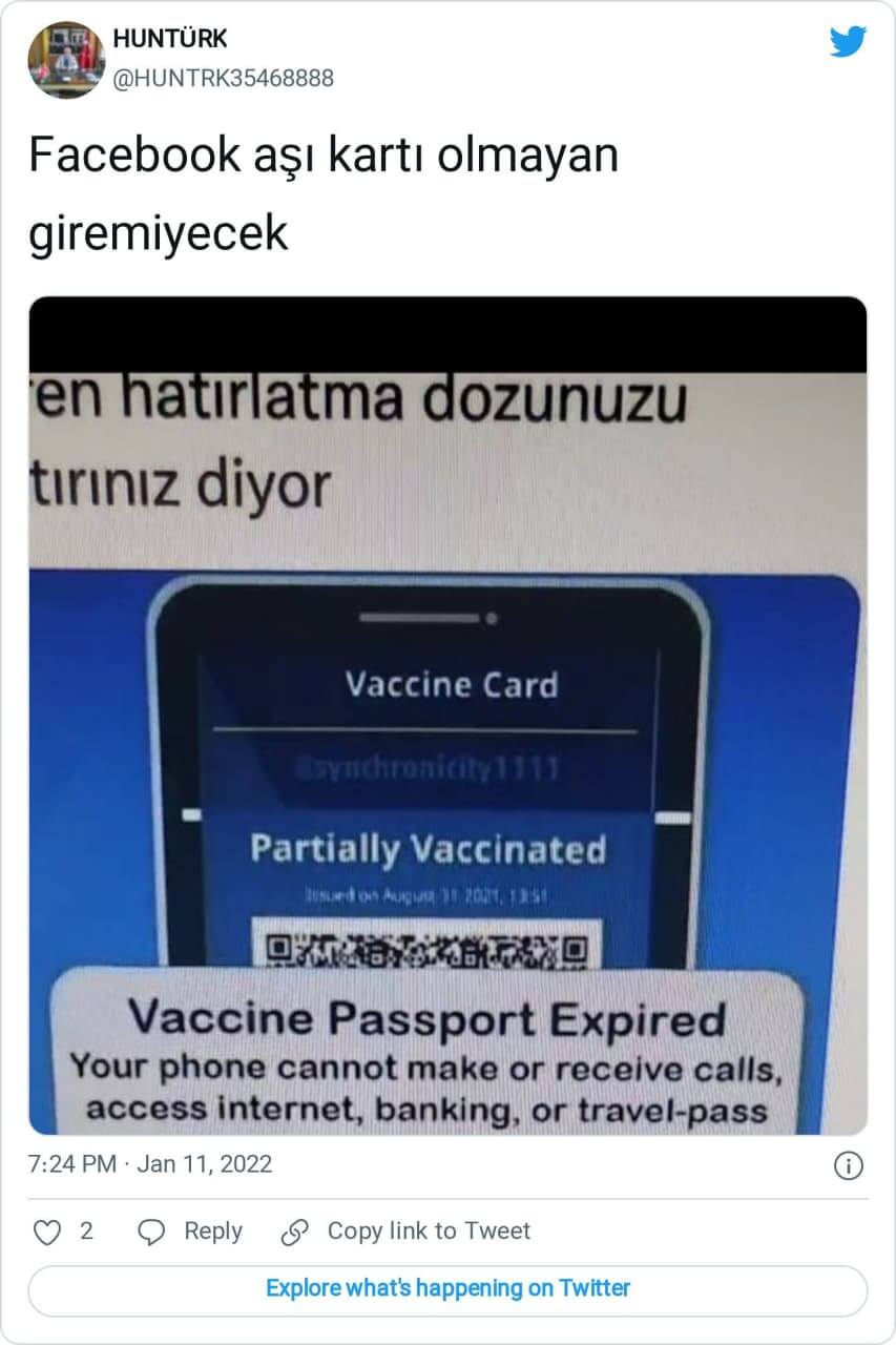 Dünyanın en büyük sosyal medya ağlarından Facebook ve Twitter’a giriş yapabilmek için koronavirüs aşısı olmanın ve aşı kartı / kimliği / pasaportu bilgilerini sunmanın gerektiği iddiasıyla aşağıdaki görsellerin sosyal medyada paylaşıldığı görülüyor.