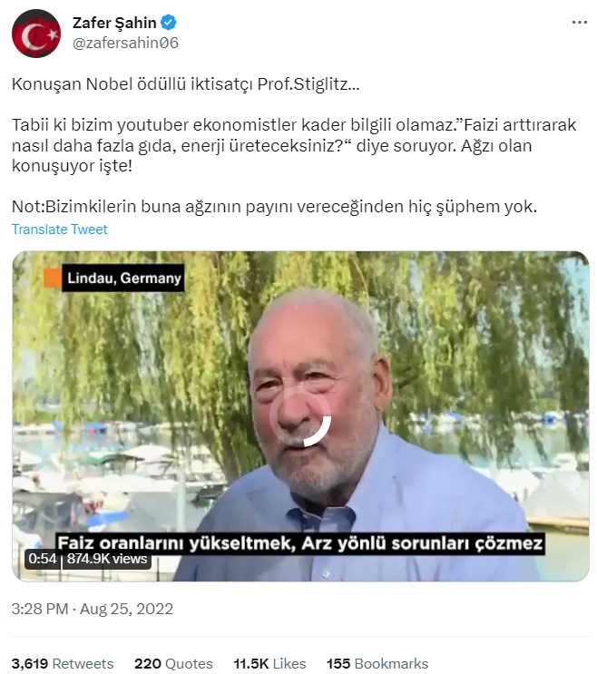 Zafer Şahin: “Konuşan Nobel ödüllü iktisatçı Prof. Stiglitz… Tabii ki bizim youtuber ekonomistler kader bilgili olamaz.” Faizi arttırarak nasıl daha fazla gıda, enerji üreteceksiniz?“ diye soruyor. Ağzı olan konuşuyor işte! Not: Bizimkilerin buna ağzının payını vereceğinden hiç şüphem yok.”