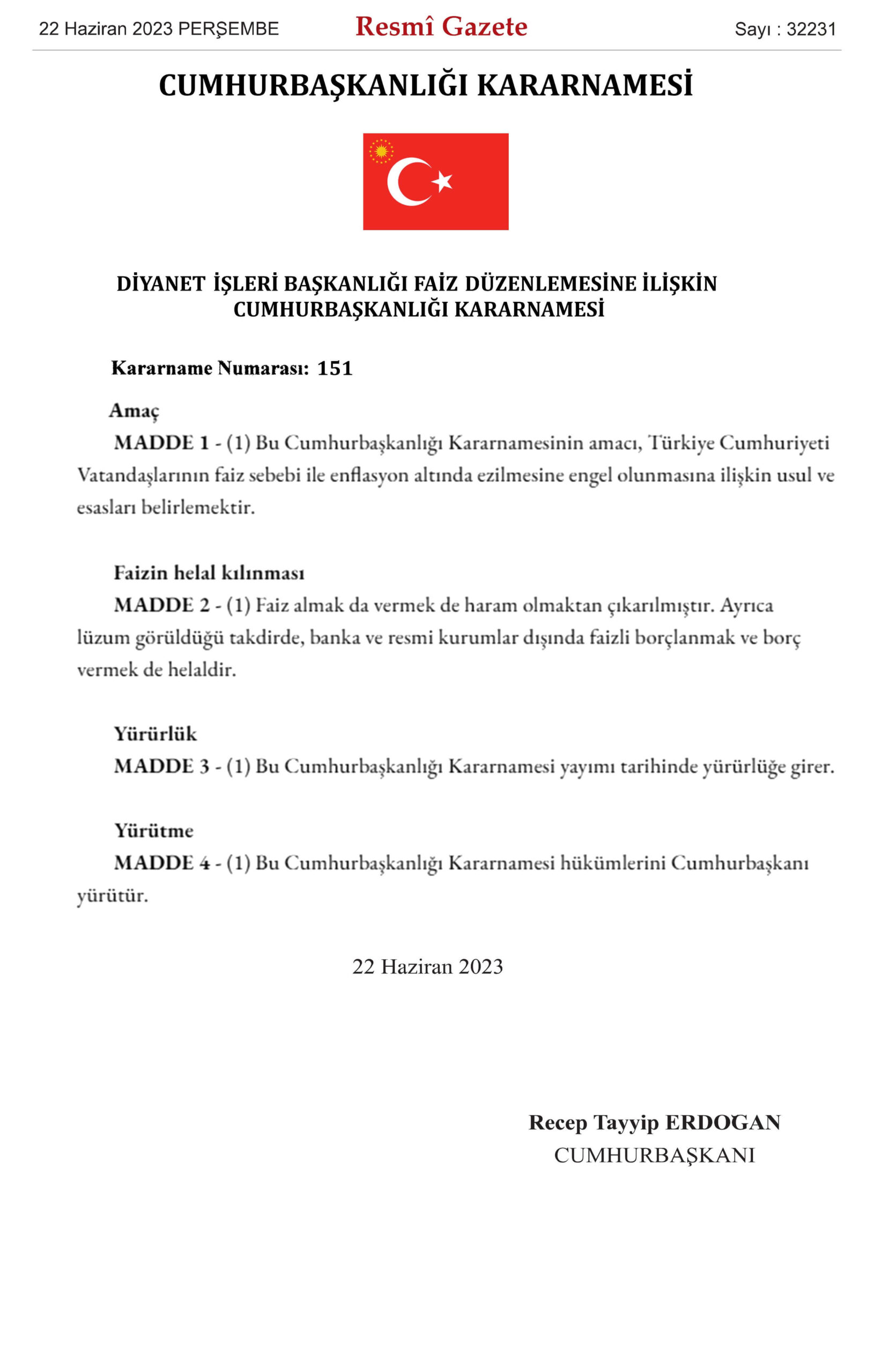 22 Haziran 2023 günü Resmî Gazete’de yayımlanan Diyanet İşleri Başkanlığı Faiz Düzenlemesine İlişkin Cumhurbaşkanlığı Kararnamesi ile faiz almanın ve vermenin haram olmaktan çıkarıldığı iddiası doğru değil