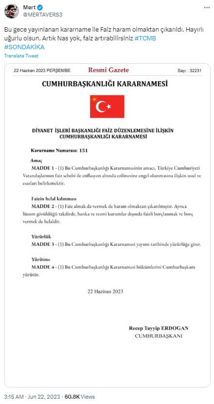 “Bu gece yayınlanan kararname ile Faiz haram olmaktan çıkarıldı. Hayırlı uğurlu olsun. Artık Nas yok, faiz artırabilirsiniz #TCMB #SONDAKİKA”