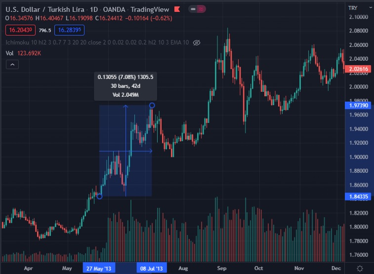 Gezi eylemleri sürecinde 27 Mayıs 2013 tarihinde 1,85 olan ABD dolar /  Türk lirası kuru 30 Haziran 2013 günü 1,92, 8 Temmuz 2013 günü ise 1,97 seviyesine yükselmişti (Eylemlerin başladığı günden hemen akabindeki kurdaki değer kaybı azami %7 oranındaydı). Ancak, bu dönemde döviz kurlarında yaşanan yukarı yönlü hareketlenmenin gerçek sebebi, 22 Mayıs 2013 tarihinde ABD Merkez Bankası Fed’in başkanı Ben Bernanke’nin ABD Kongresi’nde yaptığı “taper tantrum” olarak nitelenen “parasal daralma” odaklı konuşmasında verdiği mesajlardı. Fed’in 2008 küresel ekonomik krizinin ardından giriştiği parasal genişlemenin ilerleyen dönemde tersine çevrileceğinin Fed Başkanı tarafından bir anda dile getirilmesi, gelişmekte olan ekonomiler için bir şok etkisi oluşturmuştu (Fed’in bu açıklamasının yükselen piyasa ve gelişmekte olan ekonomiler üzerinde önemli ölçüde olumsuz etkiye yol açtığı, ilgili dönemde IMF’nin G20’ye sunduğu notta da vurgulanmıştı).