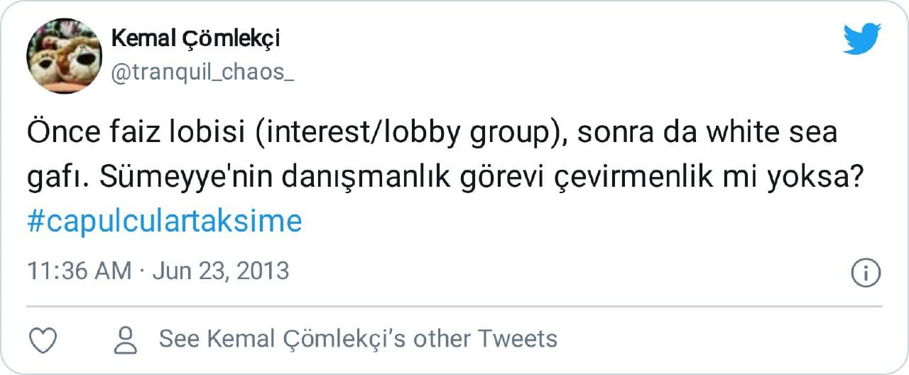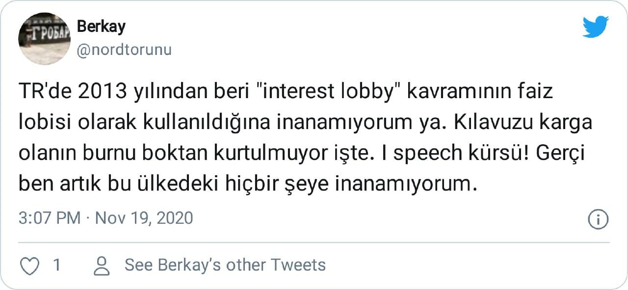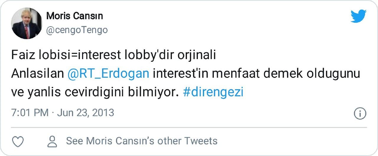 – Büyük ihtimalle Kuzey Afrika Gezisi sırasında ABD’den birileri başbakana direnişteki kitleyi “çıkar lobisi” diye tanımlamasını öneren bir metin vermiş. danışmanlar da bunu yanlış çevirince “faiz lobisi” diye protestolarla alakası olmayan bir terim ortaya çıkmış. bunu da ancak garanti bankası protestosuna bağlayabilmişler.