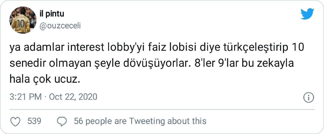 “Dış güçler”, “karanlık mihraklar”, “kriz lobisi”, “üst akıl”, “paradigma” gibi ifadelerin yanı sıra “faiz lobisi” de son yılların anahtar sözcüklerinden.