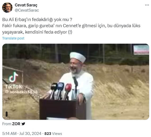 Cevat Saraç (@CevatSarac): “Bu Ali Erbaş’ın fedakârlığı yok mu ? Fakir fukara, garip gureba’ nın Cennet’e gitmesi için, bu dünyada lüks yaşayarak, kendisini feda ediyor (!)”