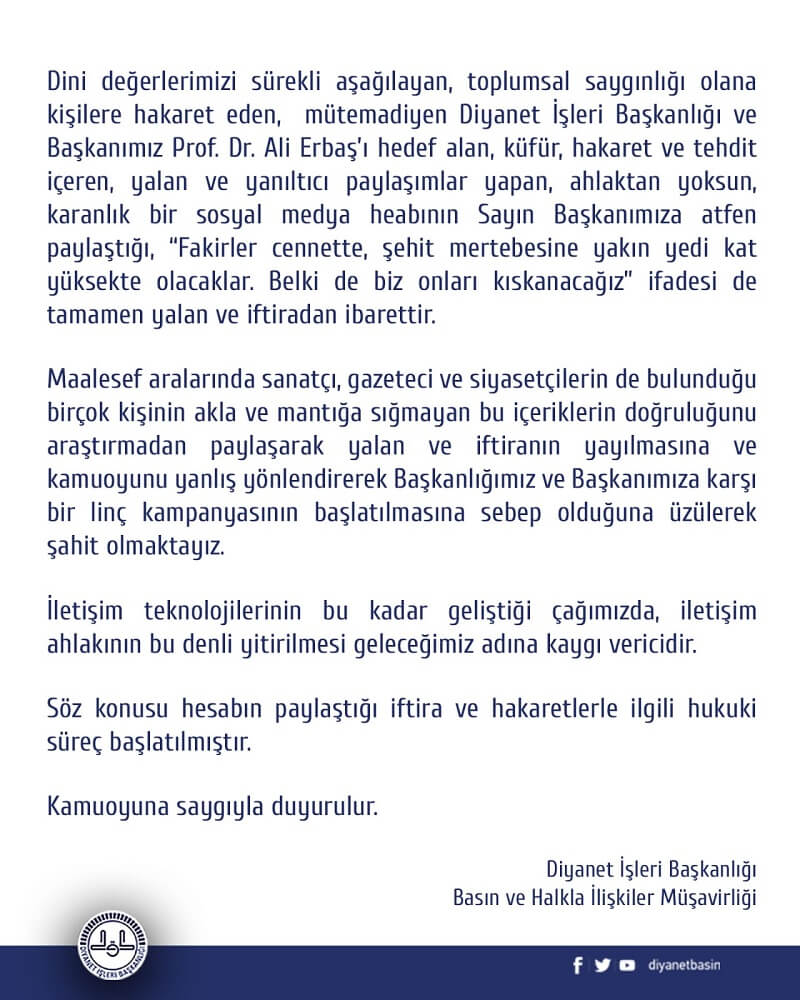 Diyanet İşleri Başkanlığı’nın “Fakirler cennette, şehit mertebesine yakın yedi kat yüksekte olacaklar. Belki de biz onları kıskanacağız” ifadesinin Ali Erbaş’a ait olmadığını belirttiği duyuru