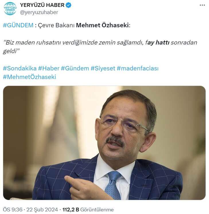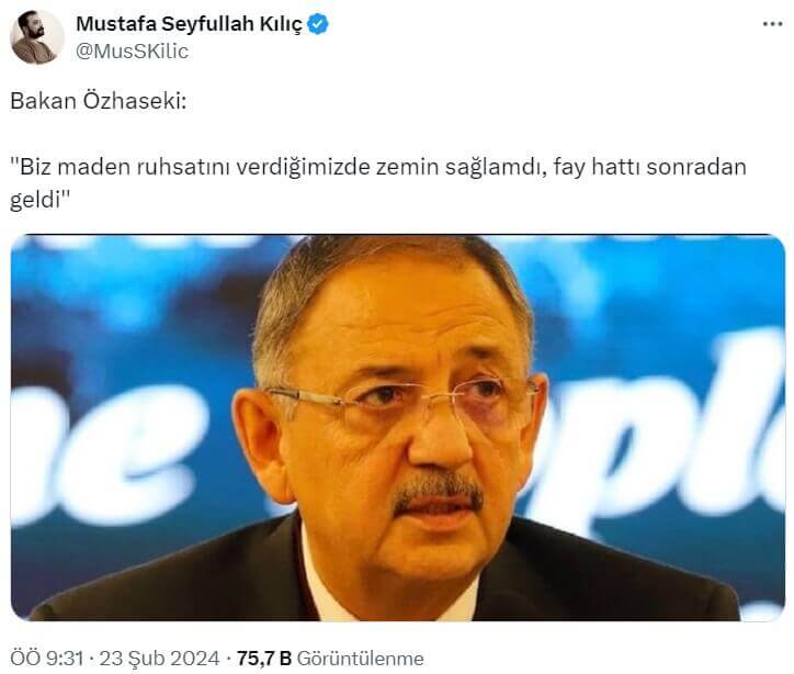 Çevre, Şehircilik ve İklim Değişikliği Bakanı Mehmet Özhaseki’nin Erzincan’daki Maden İçin “Biz Maden Ruhsatını Verdiğimizde Zemin Sağlamdı, Fay Hattı Sonradan Geldi” Dediği İddiası Aslında Bir Sosyal Medya Kullanıcısının İRONİSİ