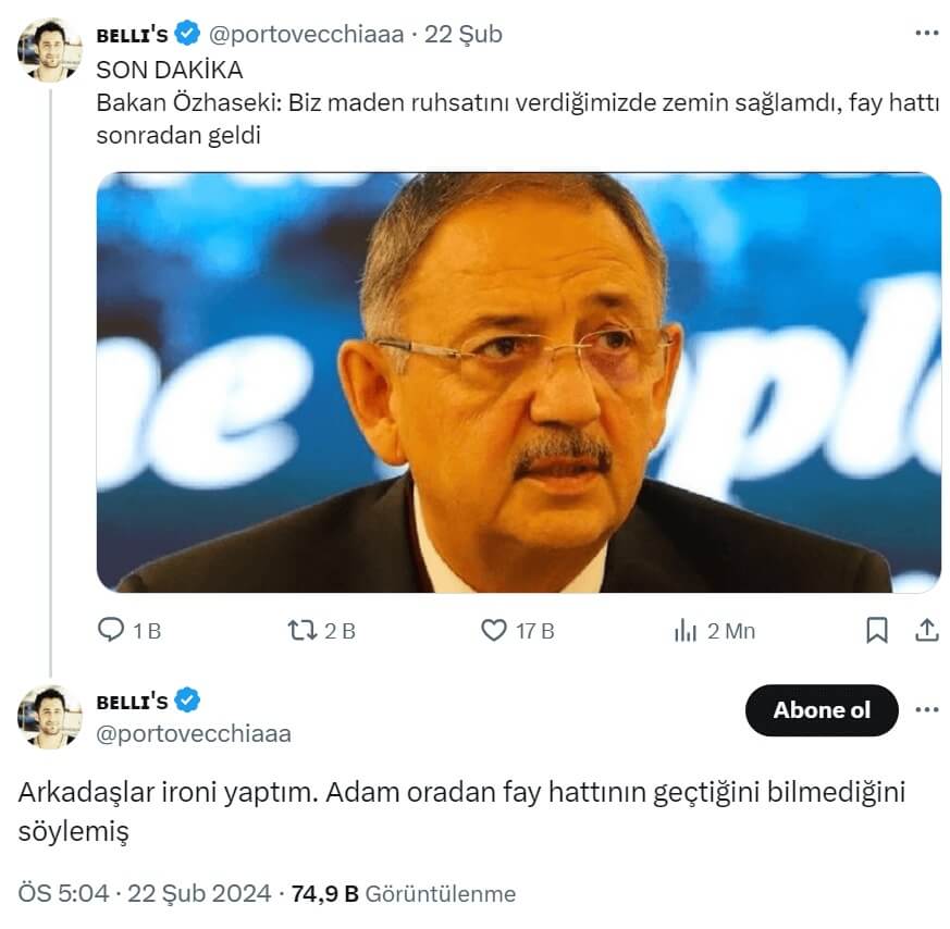 Bir sosyal medya kullanıcısının Bakan Özhaseki’nin Erzincan’daki altın madeninden geçtiği belirtilen fay hattı ile ilgili açıklaması üzerinden yaptığı ironi gerçek sanılmış.