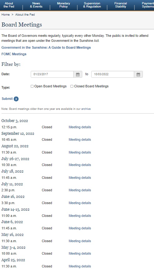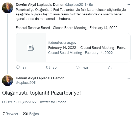 “Pazartesi’ye Olağanüstü Fed Toplantısı’yla faiz kararı olacak söylentisiyle aşağıdaki bilgiye ulaştım ama resmi twittter hesabında da önemli haber ajanslarında da rastlamadım habere. Federal Reserve Board – Closed Board Meeting – February 14, 2022”