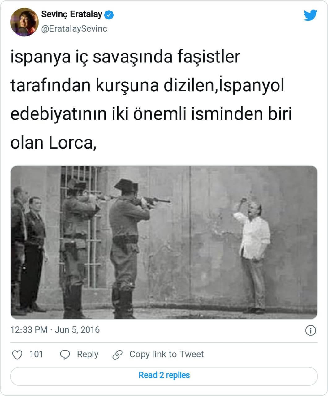 “Bunu bir dostumdan da duymuştum. Konu açıldığında anlatıyordu, Lorca kurşuna dizilirken sağ elini kaldırmış, şiir okumuş falan diye. Kendisini bir-iki kez uyardım ama sanırım hâlâ bana inanmıyor! İnternette özellikle de twitter’da dolaşan bir fotoğraf vardı; ve öğrencim de, dostum da ona görüp kabullenmişti. Neyse, göstergebilimden söz edeceğim hafta rastlantı bu ya, o fotoğraf yine dolaşmaya başladı. İnanılır gibi değildi, kimi yazarlar, gazeteciler, aydınlar falan beğeniyor, paylaşıyordu! Lorca’nın ölüm günü olarak kabul edilen geçtiğimiz 19 Ağustos’ta da yine dolaşmaya başladı. Binlerce, onbinlerce beğeni, paylaşma! (Ben de artık yazayım dedim: o fotoğraftaki adamın Lorca olmadığını!)