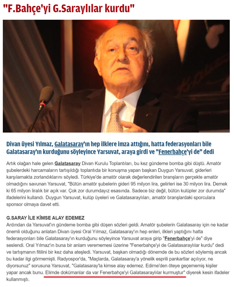 Fenerbahçe’yi Galatasaraylıların kurduğu iddiasına baz oluşturan Ali Sami Yen’in Galatasaray’dan ayrılarak kurulduktan sonra Fenerbahçe kadrosuna katılan futbolculara kötü gözle bakmadıklarını aktardığı söz şu şekildedir: