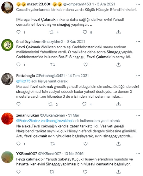 “Ne alaka, Fevzi çakmağın kendisi zaten tarikatçı idi. Vasiyeti gereği Nakşibendi tarikat şeyhi küçük Hüseyin efendi dergahı türbesine gömüldü. Artı, fevzi çakmak evini yhudilere bağışlayarak, evini sinagog yaptırdı…”