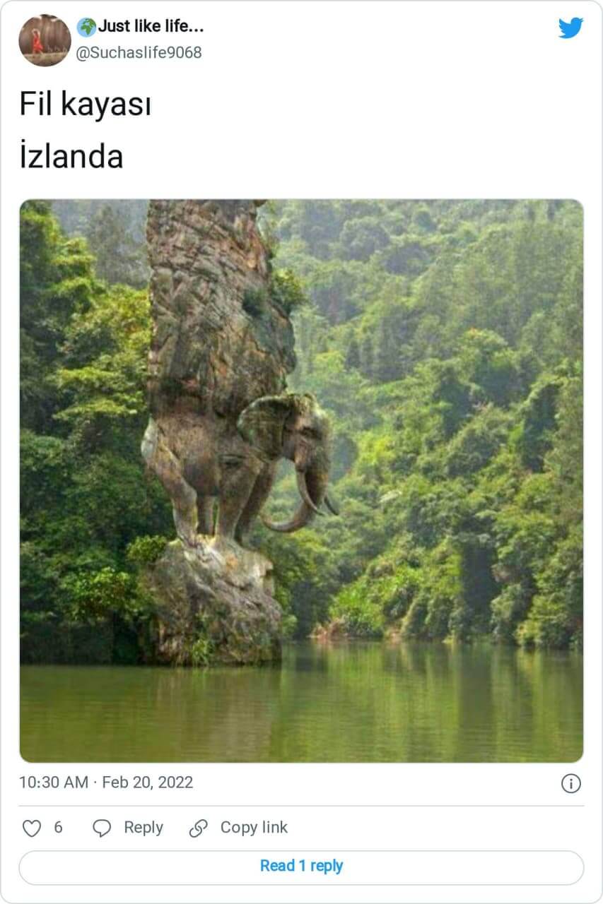 İzlanda ya da Hindistan’daki fil şeklinde kayayı yansıttığı iddiasıyla paylaşılan görsel aslında Marcel Laverdet tarafından Çin Halk Cumhuriyeti’nden bir stok görsel kullanılarak dijital müdahale ile oluşturulmuş.