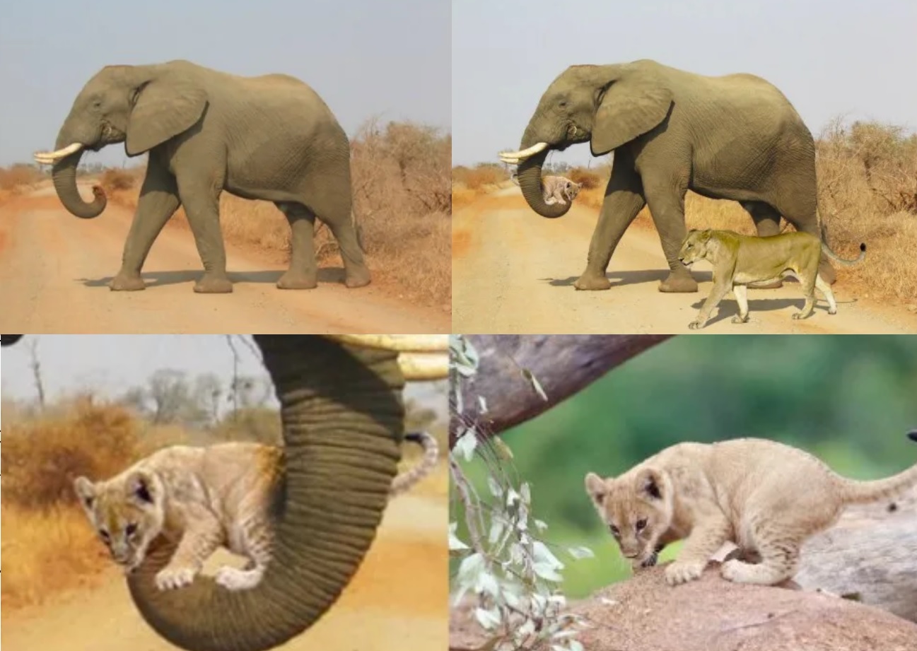 “Bitkin aslan yavrusunun annesine yetişemediğini gören filin yavru aslanı taşıdığı” ana ait olduğu iddia edilen fotoğraf karesi montajla oluşturulmuş. Fotoğrafa eşlik eden hikâye de uydurma. Montaj fotoğraf ve uyduruk hikâye, 2018 yılında Güney Afrika’daki Kruger Ulusal Parkı’na (Kruger National Park) ait bir sosyal medya hesabının yaptığı 1 Nisan şakasının ürünü.