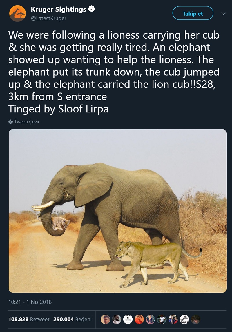 Sosyal medyada 1 Nisan 2018 tarihinden bu yana paylaşılmakta olan filin bir aslan yavrusunu taşıdığı ana ait olduğu iddiasıyla paylaşılan fotoğrafa mutlaka denk gelmişsinizdir.