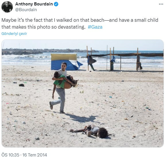 Bourdain, 16 Temmuz 2014 günü Twitter hesabında, İsrail’in hava saldırısında Gazze’deki bir plajda ölen Filistinli genç bir çocuğun görüntülendiği fotoğrafı “Belki de bu fotoğrafı bu kadar yıkıcı kılan o kumsalda yürümüş olmam ve küçük bir çocuğum olması gerçeğidir. #Gazze” (“Maybe it’s the fact that I walked on that beach—and have a small child that makes this photo so devastating. #Gaza“) cümlesiyle paylaştı.