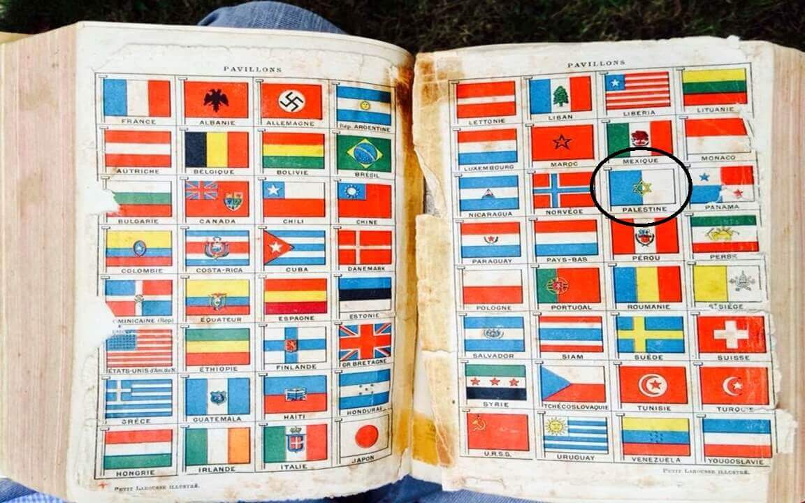Murad Çobanoğlu (@muradcobanoglu): “Birleşik Krallık Başbakanı Arthur James Balfour, adını verdiği 1917 yılında yayınladığı ve “Filistin bölgesinde Yahudi devleti kurulmasın önünü açtığı” Balfour Deklarasyonundan sonra Filistin Devleti, devrin önemli bilgi kaynağı Larousse French Dictionary’ye böyle geçmiş. Resmi büyütürseniz 1939 yılında Filistin Devleti bayrağının böyle olduğunu göreceksiniz.”