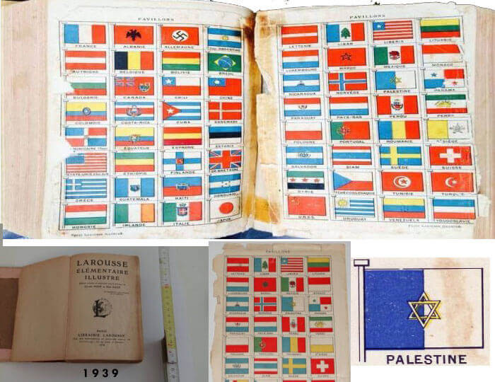 1939 Fransız Larousse sözlüğünde Filistin bayrağı dikey olarak ikiye bölünmüş mavi ve beyaz alandan oluştuğu, bayrak direği bölünde mavi kısmın yer aldığı, ortasında altı köşeli Davut yıldızının yer aldığı şekilde tasvir edilmiş.