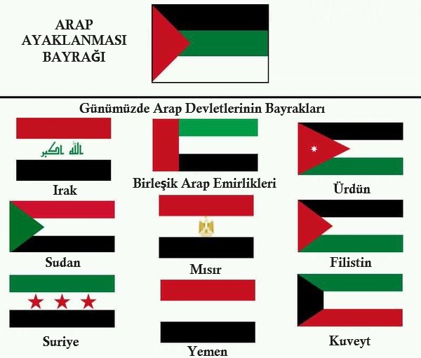 1916 yılında Şerif Hüseyin tarafından Osmanlı Devleti’ne karşı başlatılan Arap ayaklanmasının sembolü olarak üç eşit boyutta siyah, beyaz ve yeşil şeritlerden oluşan, sol üst köşesine ise kırmızı bir üçgen taşıyan bir bayrak tasarlandı (Bayraktaki siyah rengin Abbasiler Devleti’nin bayrağındaki siyah rengi temsil eder ve Arapların geçmiş acılarını ve mücadelesini; beyaz rengin Emeviler Devleti’nin bayrağındaki beyaz rengi ya da barışı ve umudu; yeşil rengin ise Fatımiler Devleti’nin bayrağındaki yeşil rengi temsil ettiği; kırmızı rengin ise direnişi simgelediği belirtilmektedir).