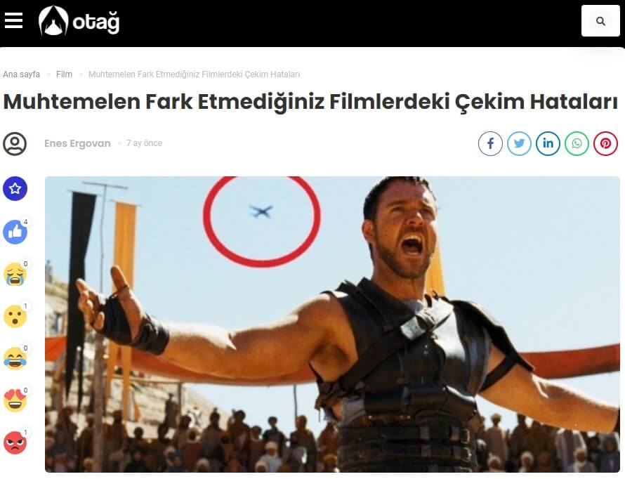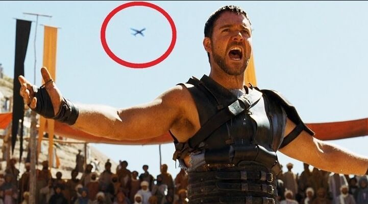 Gladyatör adlı filmde Maximus Decimus Meridius’un arenada tepki gösterdiği sahnede arka planda geçen uçağın da kadraja girdiği, bu hâliyle filmin gösterime girdiği sanılmıştı.